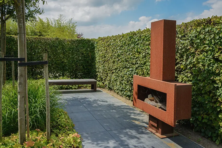 The green element is kept to the hedge, leaving a tile path that leads to a relaxing bench. The brick fireplace can be used at night for extra warmth and as a natural light source that complements the overall design.